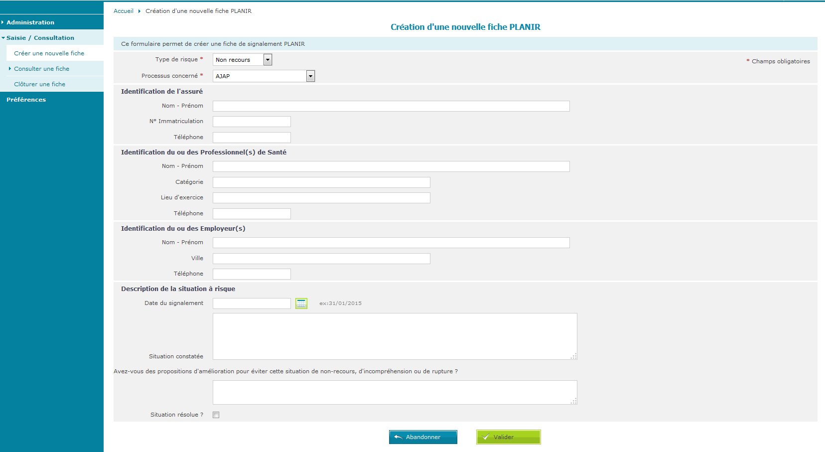 Via le menu "Saisie / Consultation" => "Créer une nouvelle fiche", vous pouvez créer une nouvelle fiche PLANIR.