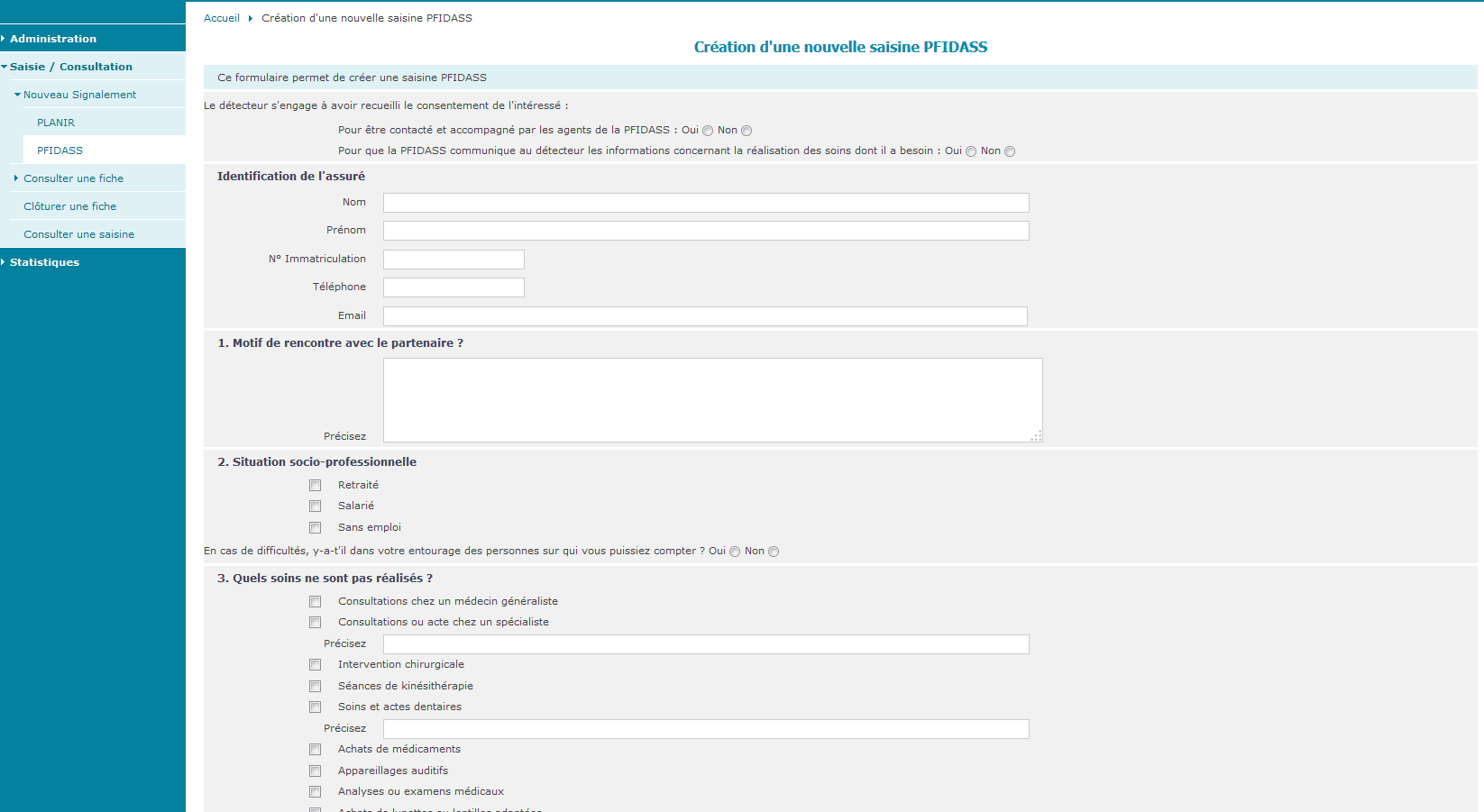 Via le menu "Saisie / Consultation" => "Nouveau Signalement" => "PFIDASS", vous pouvez créer une nouvelle saisine PFIDASS.